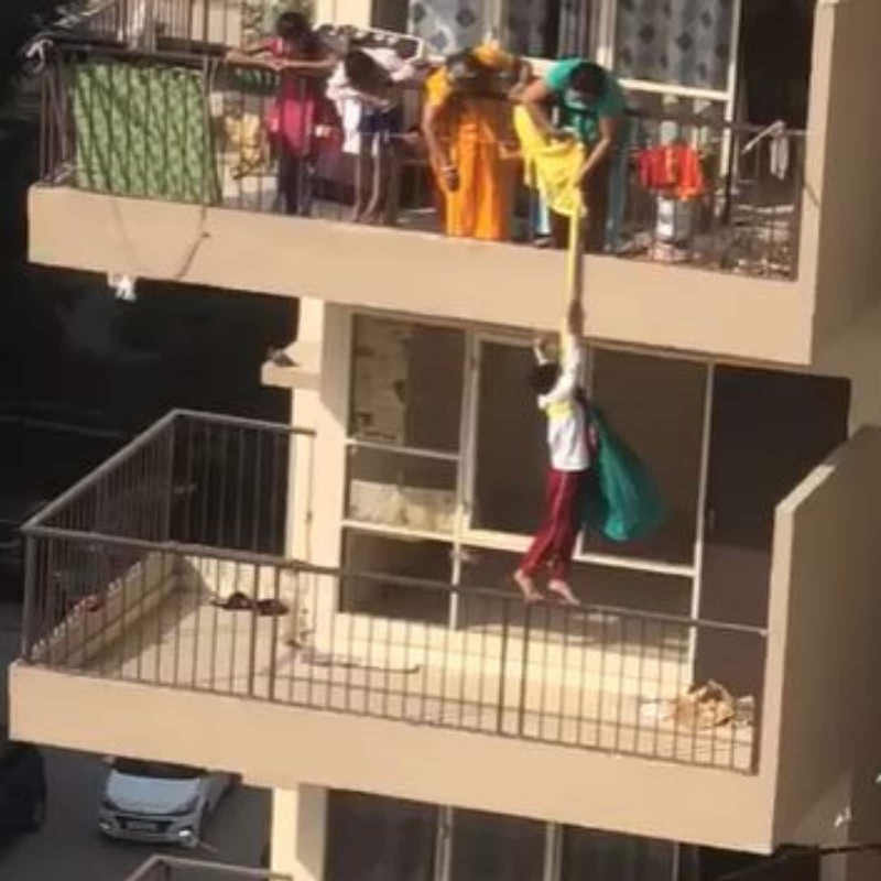 വീഡിയോയിൽ, ഒമ്പതാം നിലയിലെ ബാൽക്കണിയിൽ നിന്ന് കുട്ടി ബെഡ്ഷീറ്റിൽ മുറുകെ പിടിച്ചുനിൽക്കുന്നതും, മുകളിൽ നിന്ന് രണ്ട് സ്ത്രീകൾ ചേർന്ന് ബെഡ്ഷീറ്റ് വലിച്ചുകയറ്റുന്നതും കാണാം. സമീപത്ത് മറ്റ് രണ്ട് കുട്ടികളും നിൽക്കുന്നുണ്ട്. എട്ടാം നിലയിൽ മറ്റൊരു സ്ത്രീ സംഭവം അറിയാതെ സ്വന്തം ജോലികളിൽ തിരക്കിലായിരിക്കുന്നതും ദൃശ്യങ്ങളിൽ കാണാം.